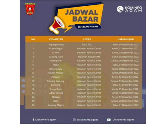 PadangTIME.com | Pemerintah Kabupaten Agam melalui Dinas Perikanan dan Ketahanan Pangan (DPKP) menggelar bazar pangan murah sepanjang Desember 2022.