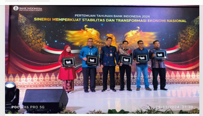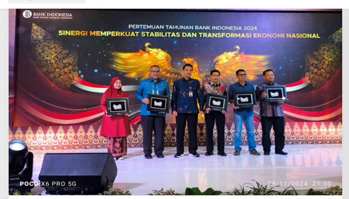Metro Padang.com- Pemerintah Kabupaten Pesisir Selatan terima Anugerah Bank Indonesia (BI) dalam pelaksanaan elektronifikasi transaksi pemerintah daerah tahun 2024. Penyerahan anugerah Bank Indonesia (BI), diserahkan langsung Deputi Kepala Perwakilan Bank Indonesia Sumbar Dandy Indarto Seno dalam Pertemuan Tahunan Bank Indonesia yang digelar di Kantor Bank Indonesia (BI) Perwakilan Sumbar di Padang, .