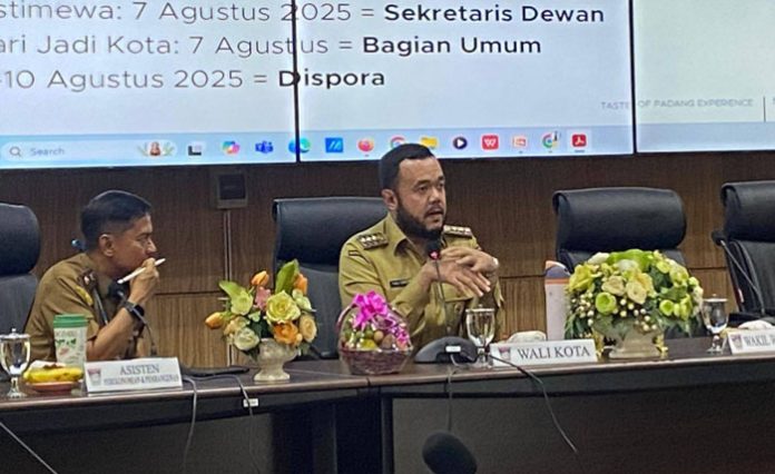 Pada rapat staf bulanan atau monthly meeting di Ruang Abu Bakar Ja’ar, Balai Kota Padang, Aie Pacah, Senin (14/7/2025), Wali Kota Padang, Fadly Amran menegaskan pentingnya koordinasi lintas perangkat daerah guna mematangkan seluruh agenda HJK ke-356.