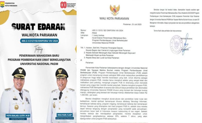 padangtime.com – Pemerintah Kota Pariaman resmi mengumumkan penerimaan mahasiswa baru untuk Program Pemberdayaan Umat Berkelanjutan (PUB) Tahun Akademik 2025/2026. Program ini merupakan hasil kerja sama antara Pemerintah Kota Pariaman, Universitas Nasional PASIM, dan Yayasan Marlina Buchari, yang ditujukan khusus untuk lulusan SMA sederajat dari keluarga kurang mampu yang ingin melanjutkan pendidikan tinggi.