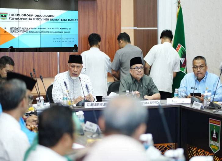 “Semua harus bergerak. Kita susun langkah-langkahnya dengan jelas, ada tahapan dan tindak lanjutnya,” tegas Mahyeldi saat memimpin Focus Group Discussion (FGD) Forkopimda bertema Mengantisipasi Illegal Mining, Illegal Fishing, dan Kelangkaan BBM di Sumatera Barat, kegiatan itu berlangsung di Istana Gubernur, Jumat (24/10/2025).
