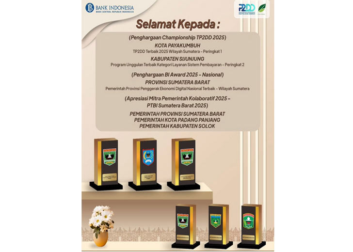 Dalam ajang Bank Indonesia Award 2025, Pemprov Sumbar meraih penghargaan nasional sebagai Pemerintah Provinsi Penggerak Ekonomi Digital Nasional Terbaik Wilayah Sumatera. Sementara pada Championship TP2DD 2025, Pemerintah Kota Payakumbuh menjadi peringkat pertama TP2DD terbaik wilayah Sumatera, disusul Kabupaten Sijunjung sebagai peringkat kedua terbaik kategori layanan sistem pembayaran.