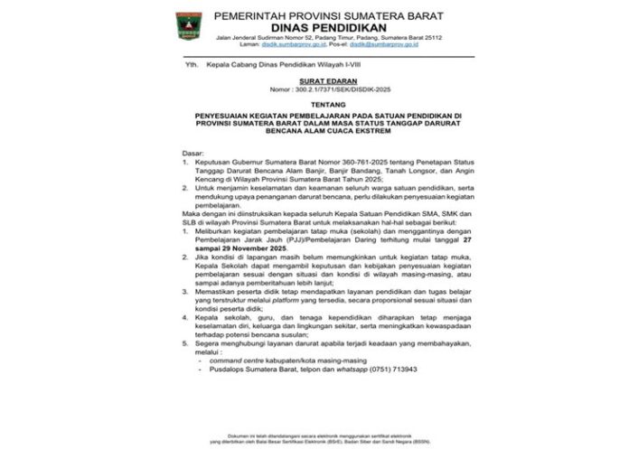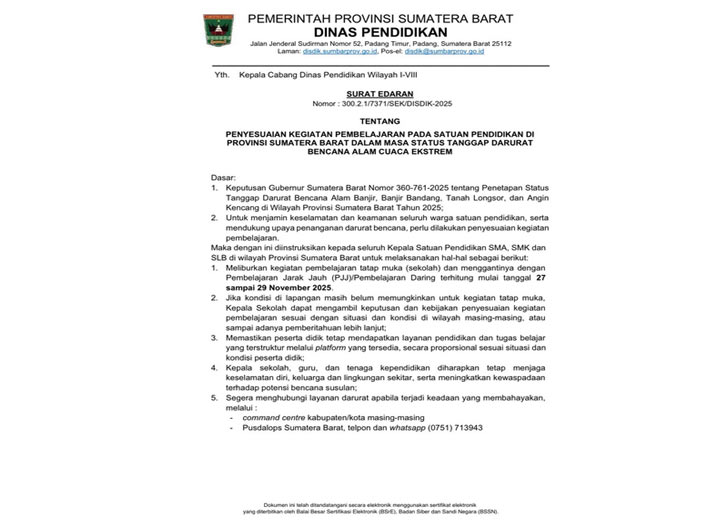 Sementara itu, Kepala Dinas Pendidikan Sumbar, Habibul Fuadi menjelaskan bahwa Surat Edaran Nomor 300.2.1/7371/SEK/DISDIK-2025 telah diteruskan kepada seluruh kepala satuan pendidikan SMA, SMK, dan SLB melalui cabang dinas masing-masing.