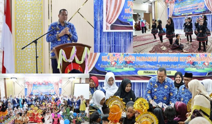 padangtime.com – Wali Kota Pariaman, Yota Balad menghadiri kegiatan pentas seni dan kreatifitas Kelompok Bermain (KB), Satuan PAUD Sejenis (SPS) yang tergabung dalam Himpunan Pendidik dan Tenaga Kependidikan Anak Usia Dini Indonesia (HIMPAUDI) Kota Pariaman di Balairung Pendopo Walikota, Selasa (17/6).