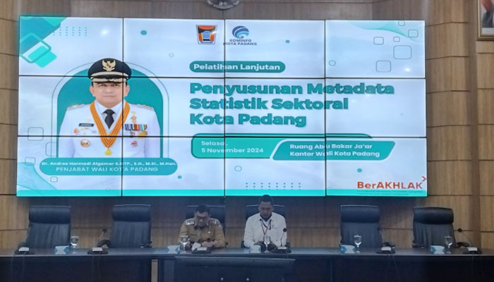 padangtime.com | Data statistik sektoral yang terintegrasi dan akurat menjadi kunci utama dalam mewujudkan Satu Data Indonesia (SDI), yang sangat penting untuk mendukung pelaksanaan tugas-tugas pemerintahan dan pembangunan di seluruh Indonesia, termasuk Kota Padang. Hal ini disampaikan oleh Kepala Dinas Komunikasi dan Informatika (Kominfo) Kota Padang, Boby Firman, dalam kegiatan *Pelatihan Lanjutan Penyusunan Metadata Statistik Sektoral Kota Padang* yang digelar di Ruang Abu Bakar Ja’ar, Kantor Wali Kota Padang, Selasa (5/11/2024).