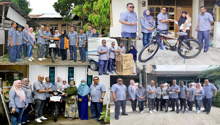 PadangTIME | Dari kantor pusat di Agus Salim, Jajaran Direksi Perumda AM Kota Padang, Dirut Hendra Pebrizal didampingi Dirum Afrizal Kuning dan perwakilan manager area pelayanan, Susipayan Manager Area Pelayanan Utara, M. Syukri, Manager Area Pelayanan Pusat serta Hendri Darmawi, Manager Area Pelayanan Selatan, langsung meluncur menuju kediaman pemenang Gebyar Pelanggan dalam rangka HUT ke 48 Tahun Perumdam Kota Padang di 3 (tiga) lokasi berbeda, yaitu di Azizi Polamas, Sungai Lareh dan Jondul Rawang.