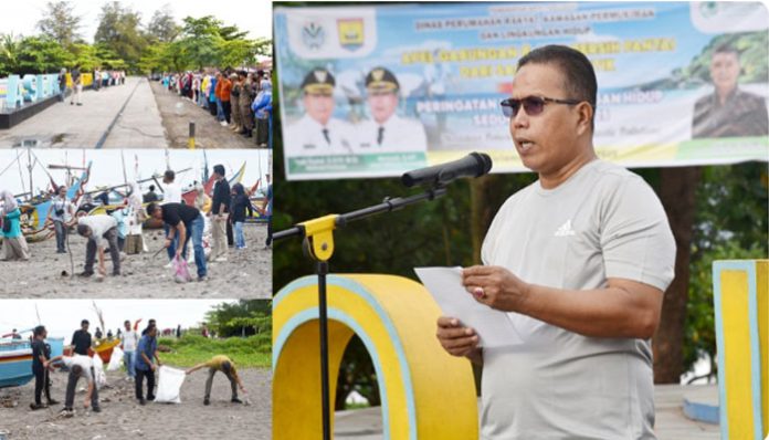 padangtime.com – Peringati Hari Lingkungan Hidup Sedunia Tahun 2025, Wakil Wali Kota Pariaman Mulyadi Pimpin Apel Bersama dan Aksi Bersih Sampah Plastik di Asean Youth Park/Tugu Pemuda Asean, Pantai Gandoriah, Kota Pariaman, Kamis (5/6/2025).