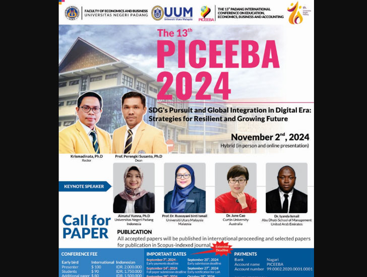 PADANGTIME.COM | Fakultas Ekonomi dan Bisnis Universitas Negeri Padang akan menyelenggarakan The 13th Padang International Conference on Economics Education, Economics, Business and Management, Accounting and Entrepreneurship (PICEEBA).