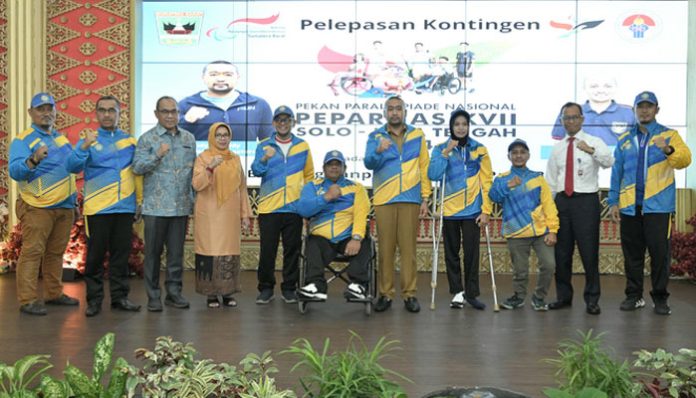 PADANGTIME.COM | Plt Gubernur Sumatera Barat (Sumbar), Audy Joinaldy, melepas secara resmi keberangkatan Kontingen National Paralympic Committee (NPC) Sumbar yang akan berlaga pada Pekan Paralimpiade Nasional (Peparnas) XVII Solo-Jawa Tengah 2024 tanggal 6-14 Oktober mendatang. Plt Gubernur berpesan, agar kontingen penuh semangat untuk merealisasikan target raihan dua emas yang dipasang.