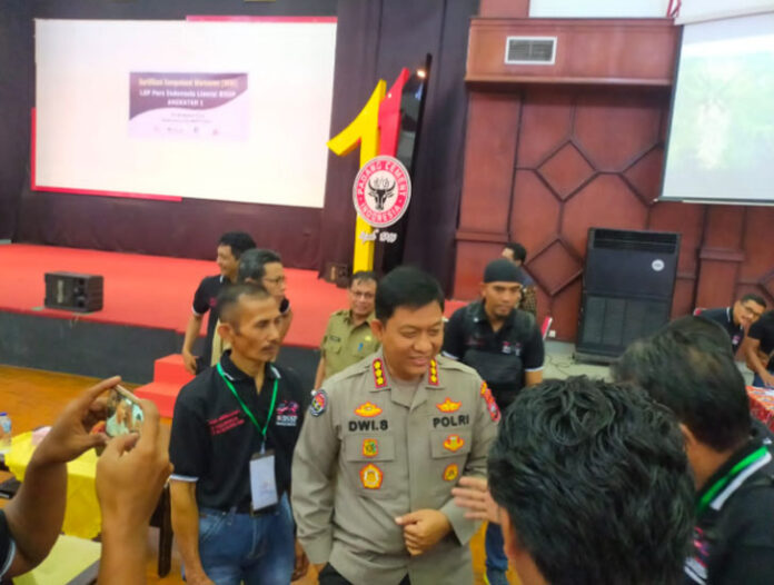 PadangTIME.com | Kapolda Sumbar Irjen Pol Teddy Minahasa Putra diwakili oleh Kabid Humas Polda Sumbar, Kombes Pol Dwi Sulistyawan apresiasi dan dukung kegiatan Sertifikasi Kompetensi Wartawan (SKW) Lembaga Sertifikasi Profesi (LSP) Pers Indonesia berlisensi Badan Nasional Sertifikasi Profesi (BNSP) Perdana di Sumatera Barat resmi dilaksanakan pembukaan hari ini di Gedung Serba Guna Semen Padang, Senin (29/8/22).