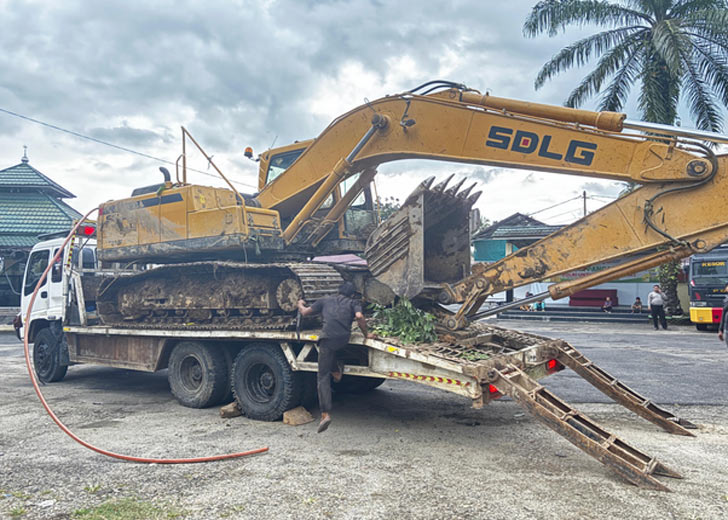 Petugas turut menyita sejumlah barang bukti, di antaranya satu unit excavator PC 210F merek SDLG warna kuning, dua alat dulang emas dari kayu, tiga lembar karpet plastik warna hijau, satu timbangan digital merek CHQ HWH Pocket Scale, serta pasir yang diduga bercampur butiran emas.