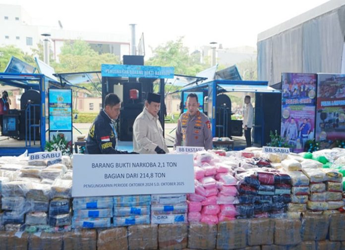 Pemusnahan barang bukti narkoba sebanyak 214,84 ton tersebut dihadiri langsung oleh Presiden Prabowo Subianto sekaligus memimpin pemusnahan barang haram tersebut di Lapangan Bhayangkara, Jakarta Selatan, Rabu (29/10/2025).