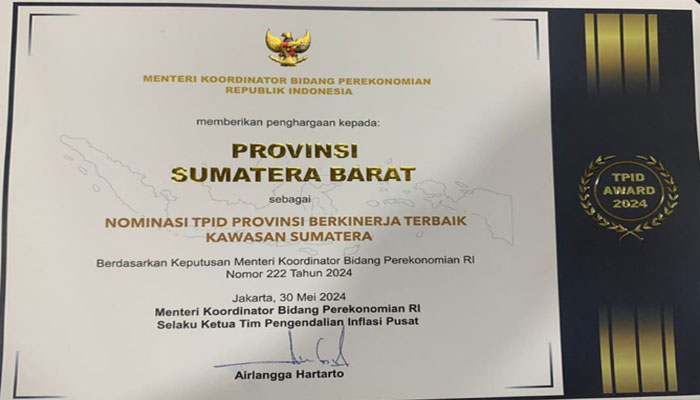 Berdasarkan Keputusan Menteri Koordinator Bidang Perekonomian RI Nomor : 222 Tahun 2024, tertanggal 30 Mei 2024, Provinsi Sumbar terpilih sebagai nominasi Tim Pengendalian Inflasi Daerah (TPID) Provinsi Berkinerja Terbaik Kawasan Sumatera.