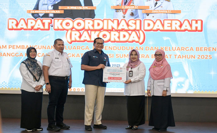Bantuan diserahkan secara simbolis oleh Kepala Departemen Komunikasi & Hukum Perusahaan PT Semen Padang, Iskandar Z Lubis, kepada Kepala Perwakilan BKKBN Sumbar, Mardalena Wati Yulia, dalam Rapat Koordinasi dan Evaluasi Program Bangga Kencana dan Quick Win BKKBN di Auditorium Gubernuran Sumbar, Rabu (30/7). Acara ini juga dihadiri Kepala Bappeda Sumbar, Medi Iswandi, yang mewakili Gubernur Mahyeldi Ansharullah.