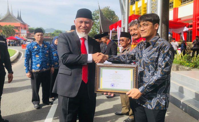 Penghargaan dari Pemerintah Provinsi Sumbar diserahkan langsung oleh Gubernur Mahyeldi kepada Bendahara Pengurus KKSP, Febby Arief Zeindra, seusai upacara Hari Koperasi tingkat provinsi di Kantor Gubernur, Kamis (17/7).