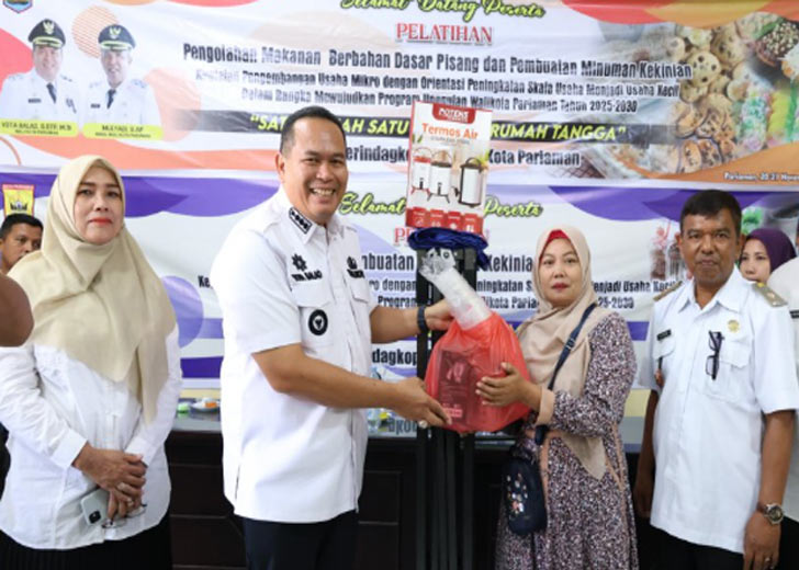 padangtime.com – Wali Kota Pariaman Yota Balad secara simbolis menyerahkan bantuan peralatan pengolahan makanan dan minuman kekinian bagi pelaku Usaha Mikro, Kecil, dan Menengah (UMKM) Kota Pariaman bertempat di Aula Dinas Perindustrian, Perdagangan, Koperasi dan UKM Kota Pariaman, Rabu (24/12/2025).