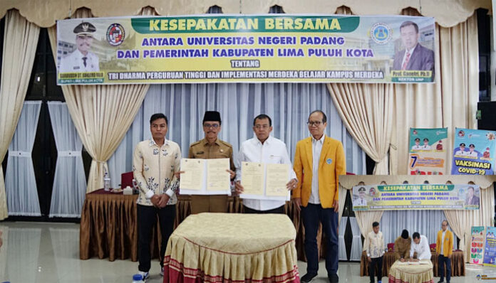 PadangTIME.com | Rektor Universitas Negeri Padang Prof. Ganefri, Ph.D dan Bupati Lima Puluh Kota Safaruddin Dt. Bandaro Rajo, Senin (4/7) menandatangani Kesepakatan Bersama antara UNP dan Pemerintah Kabupaten Lima Puluh Kota.