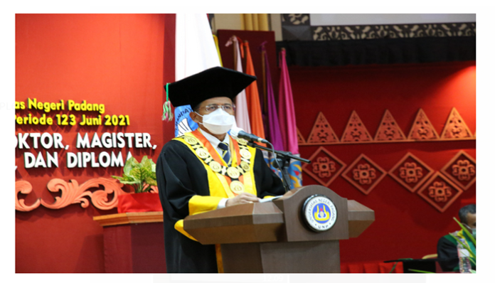 Prof. Ganefri, menjelaskan prosesi wisuda yang digelar secara luring dan daring ini dilakukan dengan menerapkan protokol kesehatan COVID-19 yang ketat.