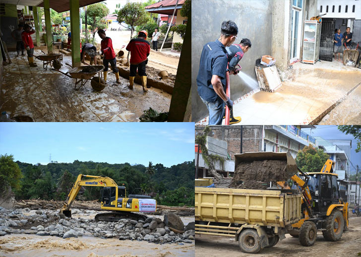 Selain bantuan logistik, perusahaan juga mengerahkan tiga unit alat berat untuk membersihkan material lumpur di sejumlah titik terdampak. Fokus utama pembersihan berada di sepanjang Jalan Raya Mohammad Hatta, jalur vital yang menghubungkan Simpang Pasar Baru dan Simpang Pasir.