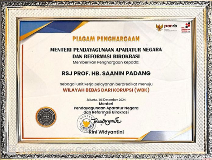 Diketahui, penghargaan zona integritas dengan predikat Wilayah Bebas Korupsi (WBK) diterima RS. Jiwa Prof. HB. Saanin karena instansi tersebut dinilai berhasil oleh KemenPAN RB membangunan zona integritas serta memiliki komitmen tinggi dalam mewujudkan pemerintahan yang bersih.