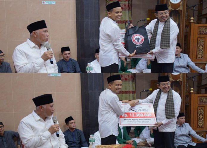 Dalam kesempatan itu, Gubernur Sumbar Mahyeldi Ansharullah juga menyerahkan bantuan hibah dari Pemprov Sumbar sebesar Rp50 juta untuk Masjid Agung Nurul Islam serta 40 mushaf Al-Qur’an.