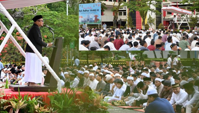 padangtime.com – Ribuan jamaah memadati Lapangan Plaza Kantor Pusat PT Semen Padang, Jumat (6/6/2025), untuk menunaikan Salat Idul Adha 1446 H. Takbir dan tahmid menggema mengiringi salat dua rakaat yang dipimpin Ustaz Riko Febrianto sebagai imam, dan H. Fardi Rahman, Lc., M.Sy. sebagai khatib.