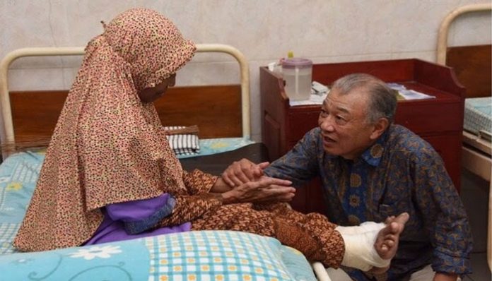 Yohei Sasakawa visiting a patient at Sumberglagah Hospital, Mojokerto Regency, East Java