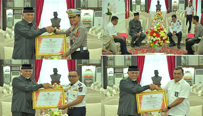 Piagam penghargaan diserahkan langsung oleh Gubernur kepada Direktur Lantas (Dirlantas) Polda Sumbar Kombes Pol Dwi Nur Setiawan dan Kepala Balai Pelaksana Jalan Nasional (BPJN) Sumbar Thabrani beserta jajaran di Istana Gubernur Sumbar, Selasa (04/06/2024).
