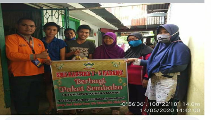 PadangTIME. com – Keluarga Besar SMA Kartika I-5 Padang setiap bulan suci Ramadhan punya program berbagi sembako dan pabukoan untuk berbuka puasa . Sedangkan tahun ini beerbagi sembako pada siawa yang kurang mampu , hal ini dikatakan Yori Guru bidang Studi Agama SMA Kartika i-5 Padang.