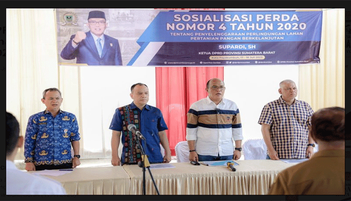 Padang TIME.com – PAYAKUMBUH – Ketua DPRD Provinsi Sumatra Barat, Supardi melaksanakan sosialisasi peraturan daerah (Perda) No 4 Tahun 2020 tentang penyelenggaraan perlindungan lahan Pertanian Pangan Berkelanjutan kepada masyarakat Payakumbuh di Agamjua Cafe, Senin (17/7/2023).