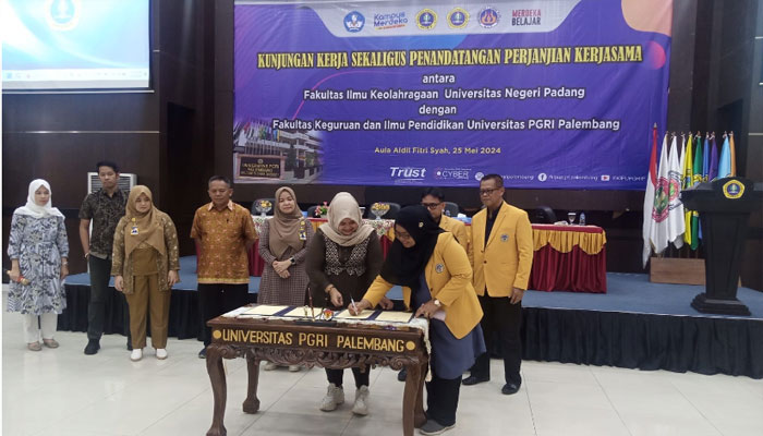 Dekan FIK UNP Prof. Nurul Ihsan, M.Pd didampingi dekan periode (2019-2024) dan koordinator program studi Doktor Ilmu Olah Raga, Prof. Dr. Alnedral, M.Pd diterima langsung oleh dekan dari FKIP Universitas PGRI Palembang Assoc. Prof Dessy Wardiah, M.Pd didampingi WD 1 (Cand) Dr.Hetilaniar, M.Pd. WD 2 Dr. Muhammad Idris, M.Pd.