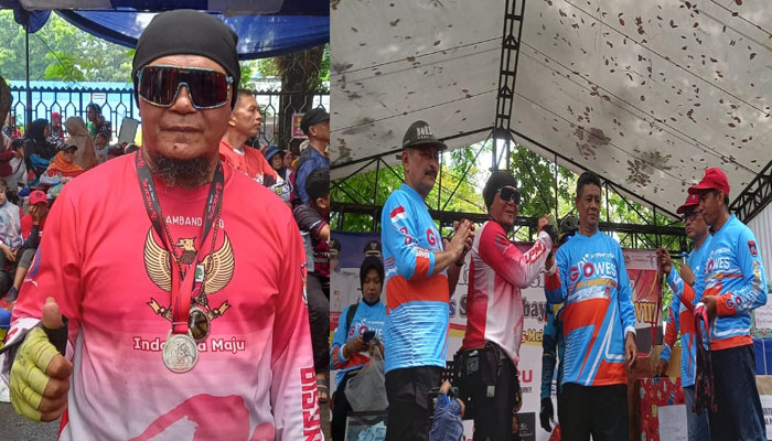 Usai menaklukkan rute yang disajikan panitia, akhirnya Thambada peserta asal Pekanbaru meraih medali. Lelaki berkulit gelap ini naik ke panggung dan dikalungkan medali, Minggu (5/5/2024).