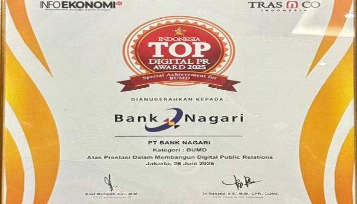 Ia menambahkan, terkait penghargaan 7th Indonesia Top Digital Public Relations Award 2025, Bank Nagari terus berupaya untuk memberikan pelayanan terbaik kepada nasabah melalui komunikasi yang baik, meliputi komunikasi langsung dengan tatap muka, maupun komunikasi digital melalui produk digital Bank Nagari.