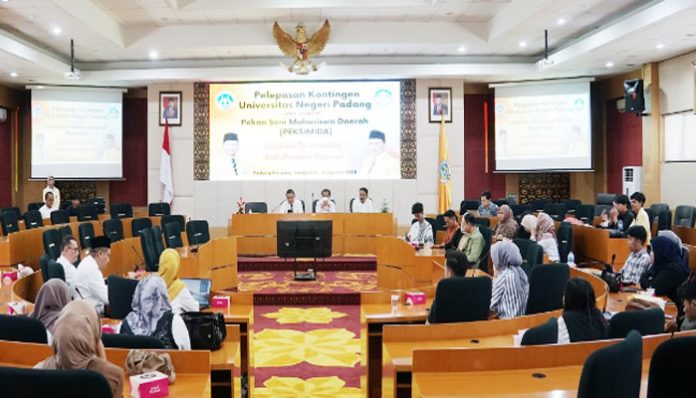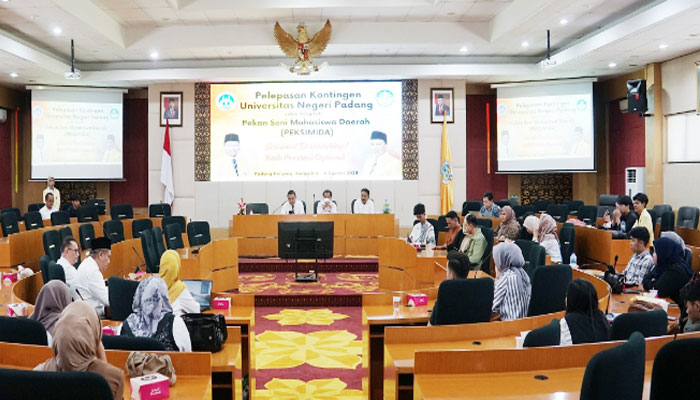 PADANGTIME.COM | Universitas Negeri Padang (UNP) menggelar acara pelepasan kontingen mahasiswa yang akan mewakili institusi tersebut dalam Pekan Seni Mahasiswa Daerah (Peksimida) 2024. Acara yang diadakan di Ruang Sidang Senat Lt. 4, Rektorat dan Pusat Penelitian UNP ini berlangsung pada Senin (5 /8), dan dihadiri oleh peserta, pimpinan universitas, serta akademisi UNP.