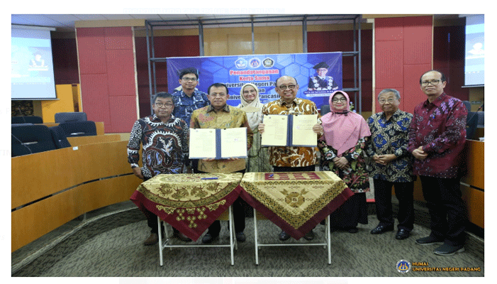 PadangTIME.com – Padang—Universitas Negeri Padang (UNP) dan Universitas Pancasila (UP) Jakarta menjalin kerja sama untuk saling menguatkan antara kedua lembaga pendidikan tinggi tinggi ini. Kegiatan ini ditandai dengan penandatanganan Nota Kesepahaman antara Rektor UNP Prof. Ganefri, Ph.D dengan Rektor Universitas Pancasila, Rabu 13/7 di Ruang Sidang Senat UNP, kampus Air Tawar Padang.