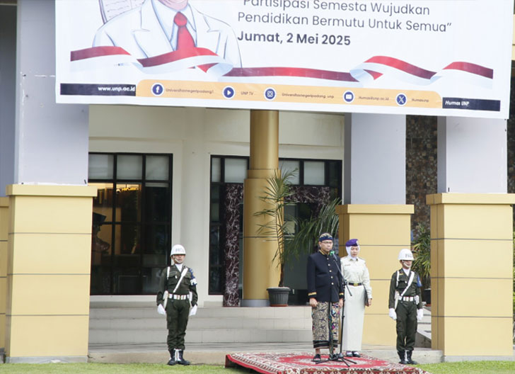 Padang— Upacara peringatan Hari Pendidikan Nasional (Hardiknas) 2025 di Universitas Negeri Padang (UNP) berlangsung khidmat dan penuh makna pada Jumat pagi (2/5), di lapangan Gedung Rektorat UNP. Upacara Hardiknas pagi ini diikuti oleh sivitas akademika yang memadati lapangan dengan balutan pakaian adat dari berbagai daerah, mencerminkan keberagaman budaya dalam semangat pendidikan nasional.