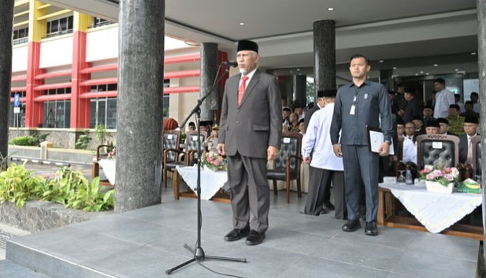 Padang – padangtime.com | Gubernur Sumatera Barat (Sumbar), Mahyeldi Ansharullah bertindak selaku Inspektur pada Upacara Hari Amal Bhakti (HAB) Kementerian Agama (Kemenag) RI ke-79 tahun 2025 di Halaman Kantor Gubernur Sumbar, Jumat (03/01/2025). Gubernur berharap, Kemenag terus memberikan contoh yang baik dalam penyelenggaraan pemerintahaan.