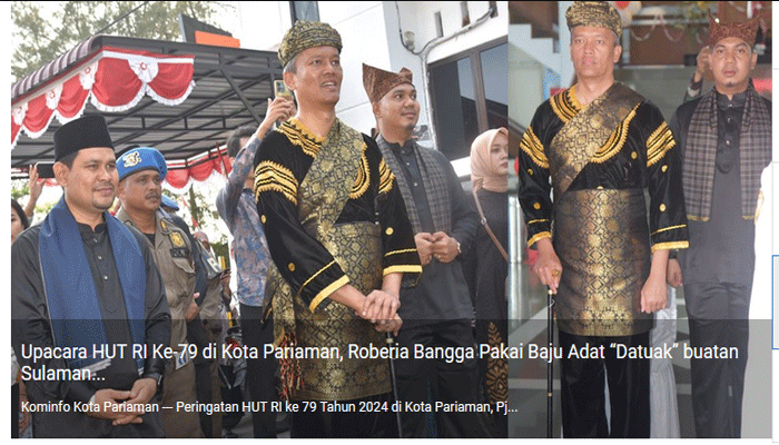 Padang TIME.com – Peringatan HUT RI ke 79 Tahun 2024 di Kota Pariaman, Pj Wali Kota Pariaman, Roberia kenakan baju adat “Datuak” asli buatan Sulaman Nareh yang berlokasi di Desa Nareh, Kecamatan Pariaman Utara.