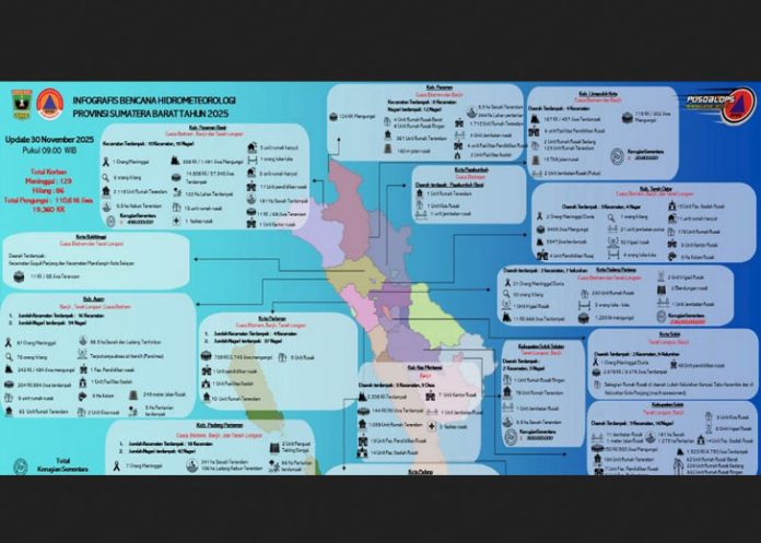 padangtime.com – Pemerintah Provinsi Sumatera Barat (Pemprov Sumbar) melalui Pusdalops BPBD kembali merilis pembaruan data korban bencana hidrometeorologi yang melanda sejumlah daerah sejak 21 November 2025. Hingga Minggu (30/11) pukul 09.00 WIB, tercatat 129 orang meninggal dunia dan 86 orang masih dinyatakan hilang.
