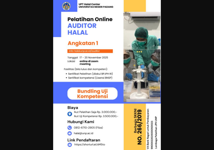 padangtime.com – UPT Halal Center Universitas Negeri Padang (UNP) telah memulai Pelatihan Auditor Halal perdana secara online. Kegiatan ini diselenggarakan tak lama setelah UPT Halal Center UNP menyelenggarakan Pelatihan Penyelia Halal pada akhir November lalu. Pelatihan Auditor Halal ini berlangsung intensif selama empat hari penuh, mulai dari Senin, 17 November hingga Kamis, 20 November 2025.