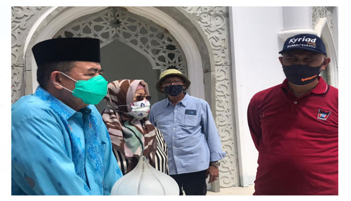 Nasrul Abit dan Mahyeldi menyempatkan diri meninjau terhadap proses pembangunan masjid Al-Hakim, yang terletak di jalan Sumudera ujung pantai Padang, Sabtu (6/6/2020).