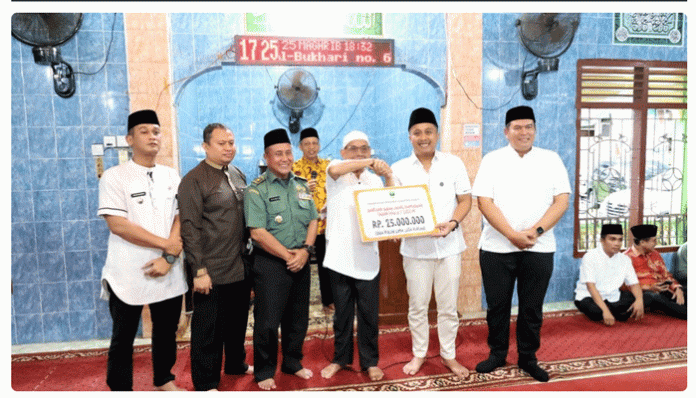 Bantuan diterima langsung oleh pengurus Masjid Raya Nurul Iman disaksikan oleh jamaah masjid dan tokoh masyarakat setempat.(fadli)
