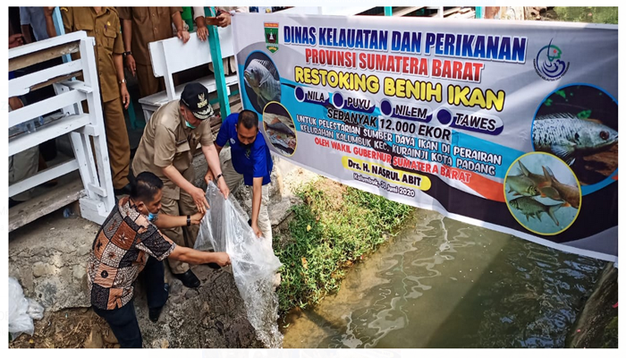 Hal ini disampaikan Wakil Gubernur Sumatera Barat Nasrul Abit menyerahkan bantuan restocking bibit ikan puyu, Nila, Nilem dan Tawes sebanyak 12.000 ekor dan menebarkannya untuk pelestarian sumbar daya ikan dan memenuhi kebutuhan ikan bagi masyarakat di perairan Kelurahan Kalumbuk Kecamatan Kuranji, Padang, Selasa (30/6/2020).