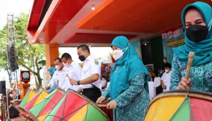 Pembukaan Jambore Kader PKK Berprestasi ke-XVIII Tingkat Provinsi Sumatera Barat Tahun 2021 yang ditandai dengan pemukulan gendang dihadiri juga oleh Ketua TP-PKK Provinsi Sumbar, Ny. Hj. Harneli Mahyeldi, Wakil Ketua TP-PKK Sumbar, Ny. Fitria Amalia Audy, Bupati/Walikota se Provinsi Sumatera Barat, Wakil Bupati/ Wakil Walikota se Provinsi Sumatera Barat, Forkopimda Kota Pariaman, Ketua TP-PKK Kota Pariaman Ny. Lucyanel Arlym Genius bersama Wakilnya Ny. Indriati Mardison serta Pengurus TP-PKK kabupaten/kota se-Sumbar. (PT)