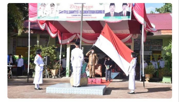 PadangTIME.com – Wakil Walikota Pariaman, Mardison Mahyuddin bertindak selaku inspektur upacara dalam rangka memperingati Hari Amal Bhakti (HAB) Kementerian Agama (Kemenag) ke 76 tingkat Kota Pariaman tahun 2022 yang digelar di MTsN 1 Kota Pariaman, Desa Pauh Barat, Kecamatan Pariaman Tengah, Senin (3/1).