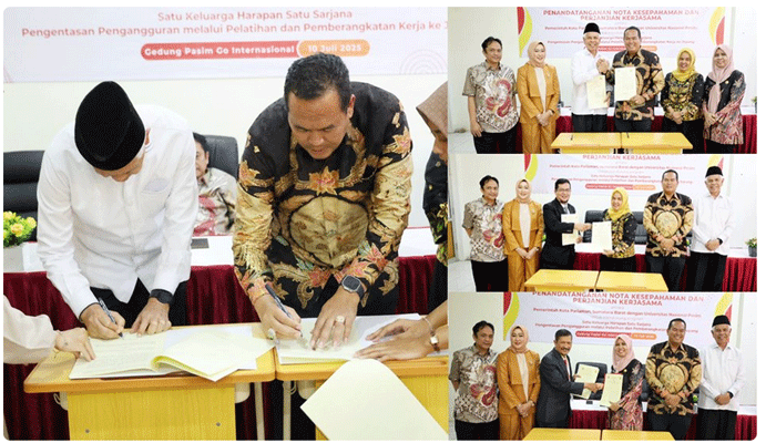 PADANG Time.com – Wali Kota Pariaman Yota Balad Tanda tangani Memorandum of Understanding (MoU) dengan Universitas Nasional (UNAS) PASIM Bandung terkait Proram Unggulan Saga Saja (Satu Keluarga Satu Sarjana) Plus daerah yang dipimpinya, di Kampus UNAS PASIM, Bandung Provinsi Jawa Barat, Kamis (10/7/2025).