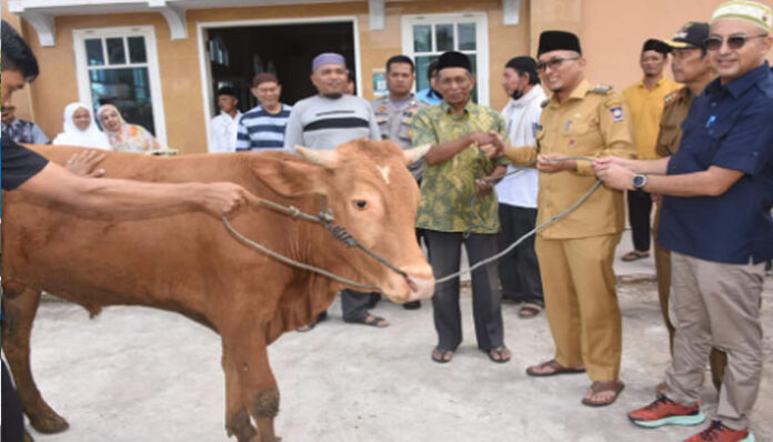 PadangTIME.com | Wali Kota Padang Hendri Septa bersama Direktur Utama Perumda Air Minum Padang Hendra Pebrizal, berserta jajaran melakukan penyerahan secara simbolis hewan kurban di Kecamatan Pauh, Selasa (5/7/2022).