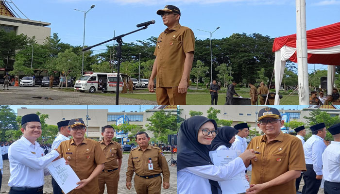 Kota Padang – Wali Kota Padang Hendri Septa menyerahkan SK kepada 2.824 Pegawai Pemerintah dengan Perjanjian Kerja (PPPK). SK diberikan di Lapangan Apeksi Balaikota, Senin (6/5/2024).
