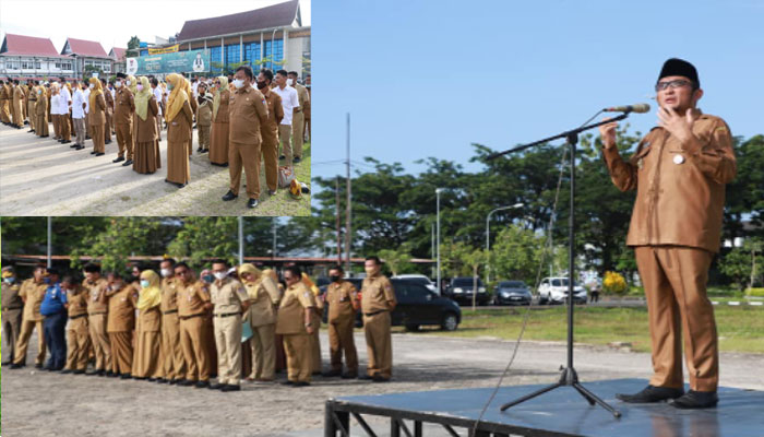 Sebelum memulai sidak Wako Hendri memimpin apel gabungan yang diikuti para pimpinan dan ASN yang berkantor di Komplek Perkantoran Balai Kota Padang Aie Pacah.