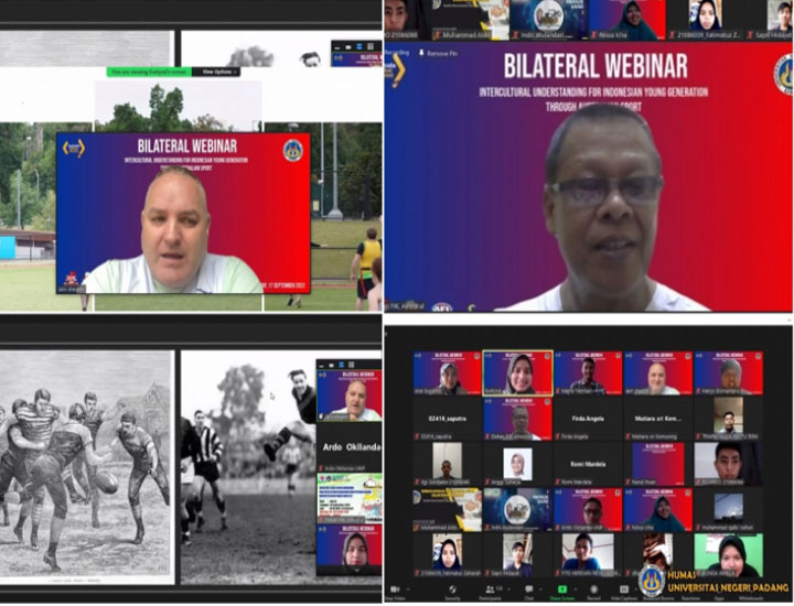 PadangTIME.com | Universitas Negeri Padang (UNP) Fakultas Ilmu Keolahragaan pagi ini pukul.10.00 melaksanakan webinar Bilateral Australia-Indonesia dalam bentuk Australia Football League (AFL) virtual tour tahun 2022 dengan tujuan mengembangkan Pemahaman Antarbudaya bagi Generasi Muda Indonesia dengan Mengenali Olahraga khas Australia: Australian Football League.